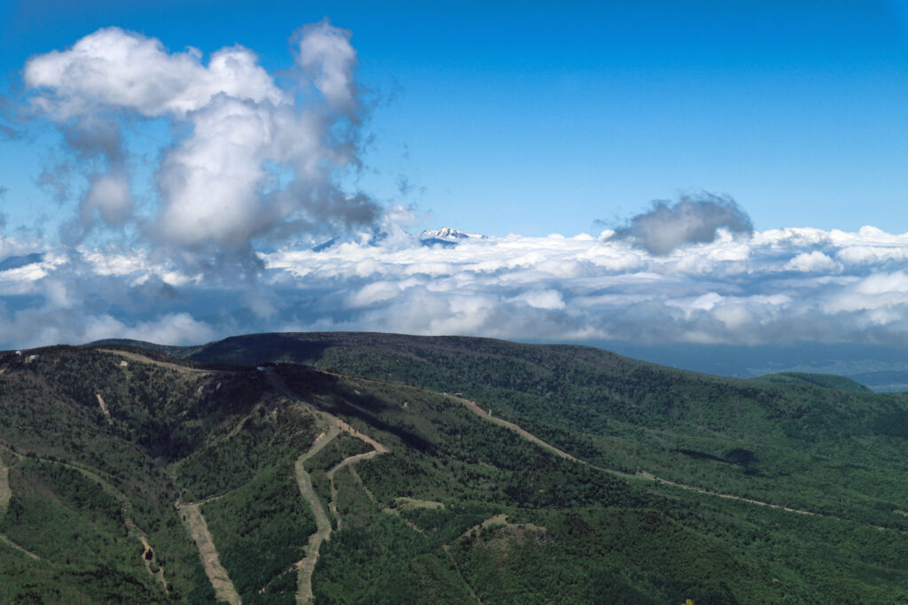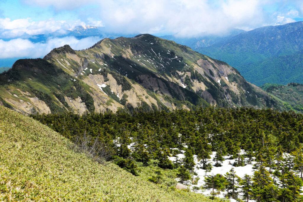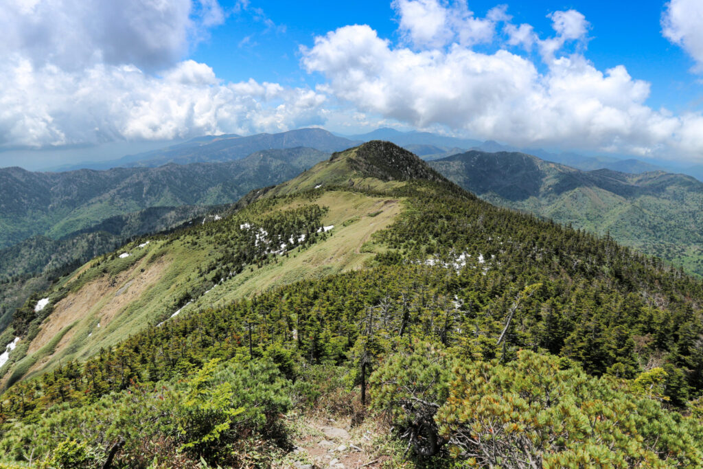 まだ雪が残る6月上旬の開山祭の頃、登ってきました。天候は晴れで、まだ少し寒いくらいでしたが山歩きにはちょうどよく、爽快な登山ができました。朝、登山口の駐車場に着くと既に満車で、今回も苦労し離れた所にやっと駐車できました。登山開始後、川底が緑色のグリーンタフ(緑色凝灰石)でできた沢沿いを歩きましたが、陽が河に差し込むと川底の緑色が一層映えました。志賀高原は雪深い地域で、登山道の所々に残雪がありました。岩菅山山頂は広々とし、周りの山々(横手山、笠ヶ岳、四阿山、苗場山など)が見渡せましたが、頸城山塊の火打山にはたっぷり雪が残っていました。その後、裏岩菅山まで足を延ばしましたが、中ノ岳への美しい稜線が印象的でした。
