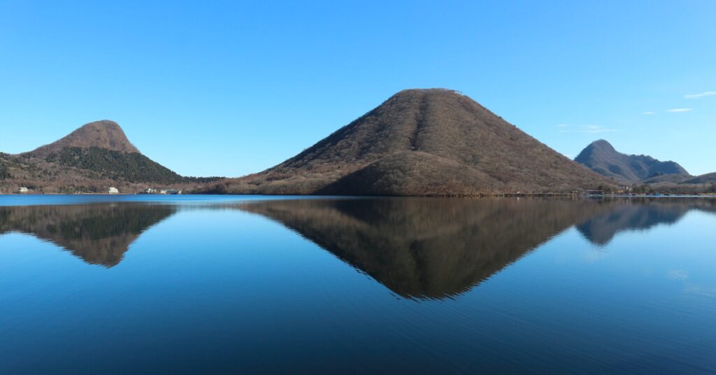 榛名湖面に映る榛名富士(中央)と烏帽子ヶ岳(左)